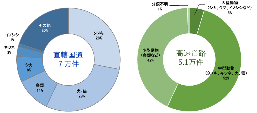 自動車と動物が接触する事故(ロードキル)の件数は、国土交通省が管理する直轄国道上で約7万件、高速道路上で約5万件(いずれも2022年度)発生しています。