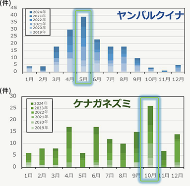 ロードキルデータの分析から、ヤンバルクイナとケナガネズミのロードキル多発箇所はほぼ同一区間にて発生しているほか、多発時期(ヤンバルクイナは5月、ケナガネズミは10月)および多発時間帯(早朝および夕方)を確認しました。
