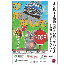 ロードキル多発箇所では、①路面表示、②カーナビゲーションを用いた注意喚起、ロードキル多発時期には、③コンビニエンスストアへの啓発ポスターの掲示、の3つの取り組みを実施します。