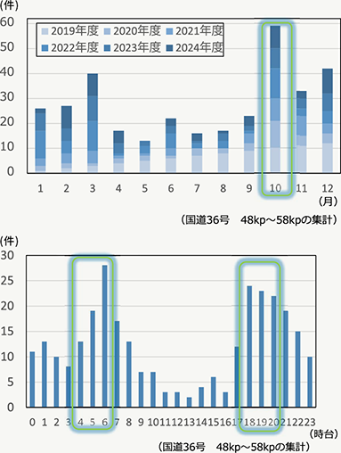 ロードキルデータの分析から、多発区間や多発時期(10月、早朝および夕方)を確認しました。
