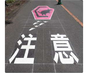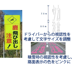 動物の事故特性を踏まえて路面表示にてドライバーに注意喚起を行うイメージ