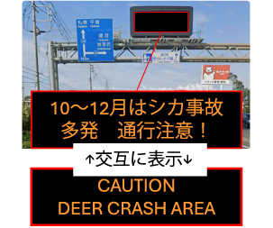 ロードキル多発箇所で、①路面表示・注意看板の設置、②エゾシカ衝突事故マップの配布、③道路情報板を活用した注意喚起、の3つの取り組みを実施します。
